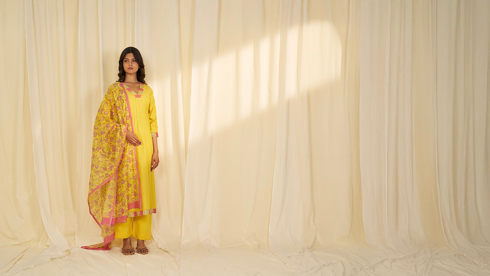 This bright yellow Chanderi dupatta features an all-over floral print in rose pink and soft green tones, and is finished with a solid pink border.