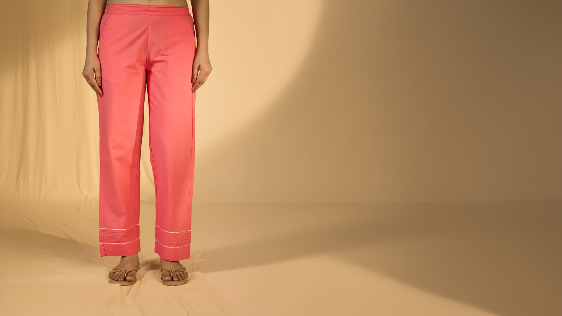 The Too Pink Cotton Straight Pant adds a vibrant pop to your wardrobe with its bright pink shade. Crafted from lightweight cotton, these straight-cut pants come with subtle pleat details at the hem bordered by silver Gota work, side pockets, and a semi-elasticised waistband, combining style and comfort effortlessly.