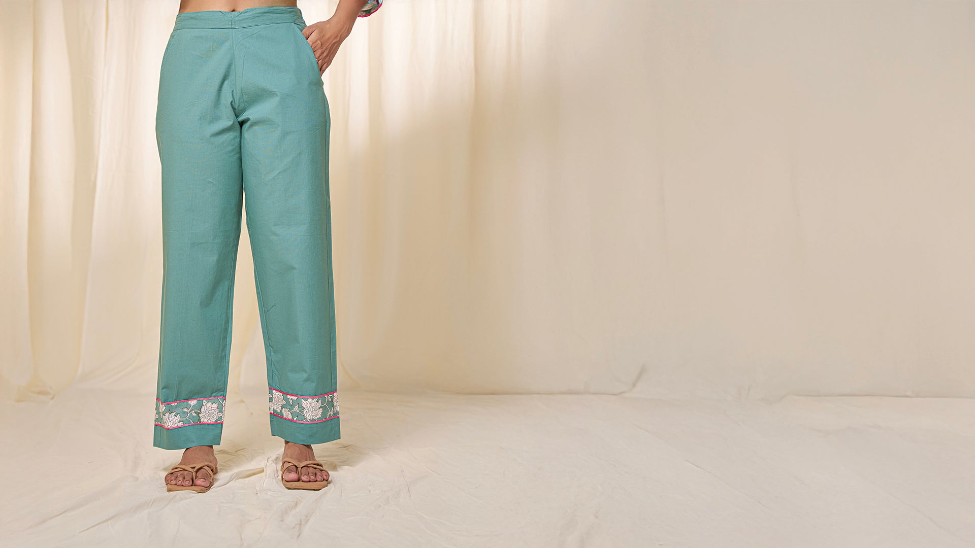 These dark sage green straight pants feature hand block printed fabric appliqués, elegantly highlighted with polysilk piping. Designed for comfort and style, they include two side pockets and a semi-elasticized waist with a drawstring.
