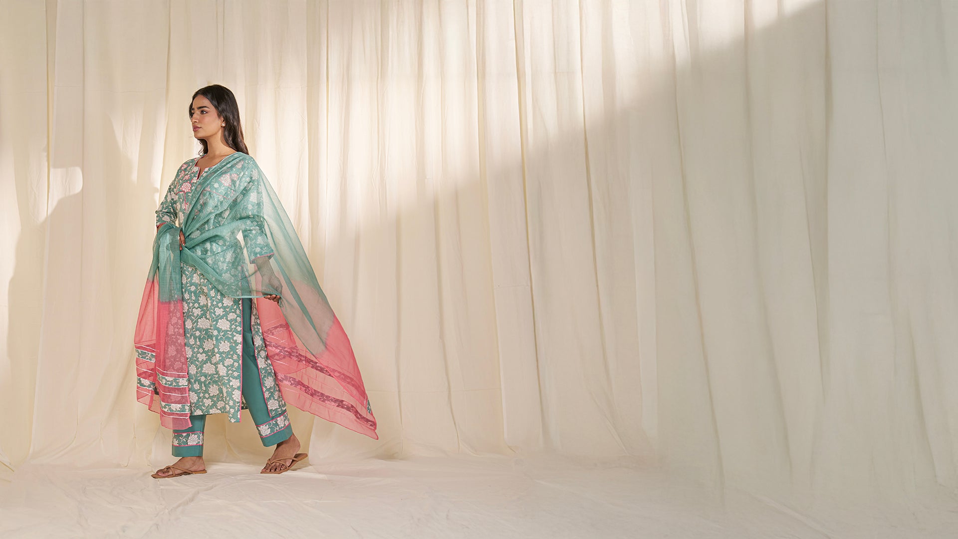 This exquisite hand-dyed Kota Doria dupatta in dual shades of green and peach-pink features delicate hand block printed fabric strips. Accentuated with shimmering silver gota lace, it adds elegance and charm to any ensemble.