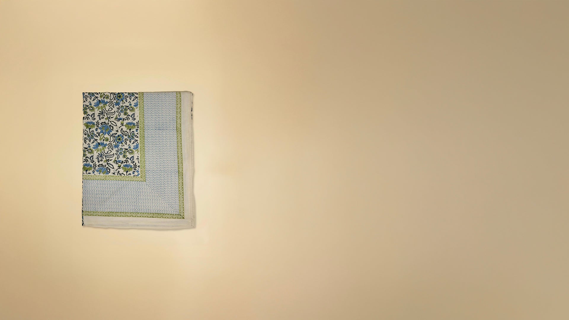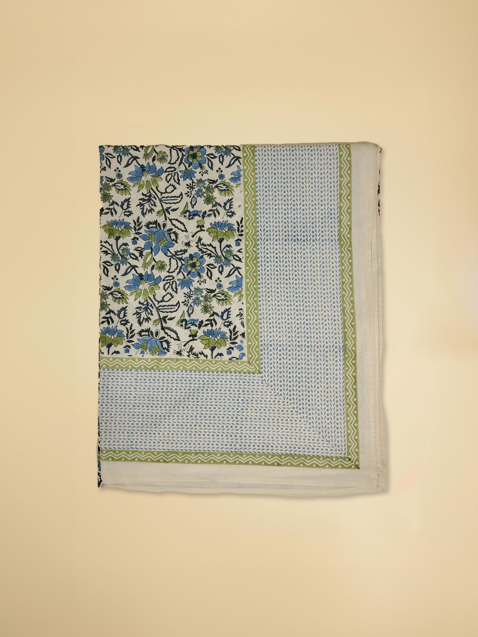 Refresh your bedroom with the Udaipur Bed Cover, featuring soothing blue and green floral designs on a clean white backdrop. The cover is bordered by a striking thick blue leaf pattern, flanked by a green block print stripe on both sides, creating a refined, cohesive look. Made from soft, breathable fabric, this bed cover combines comfort with a vibrant, stylish aesthetic that suits any decor.