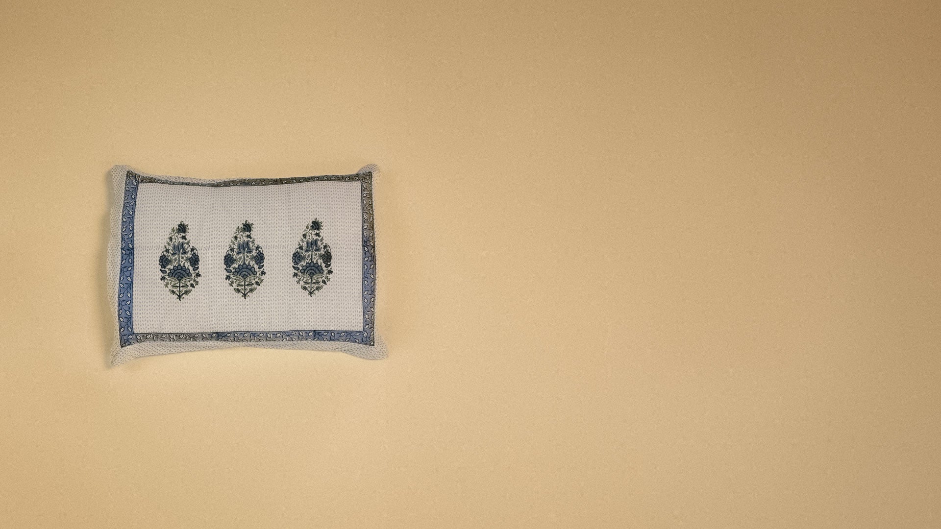 This set of Udaipur pillow covers features a trio of intricate blue and green floral motifs on a soft white background. The design is framed with a deep blue leaf-patterned border that adds a touch of elegance and contrast, making it perfect for enhancing any bedroom or living space decor.