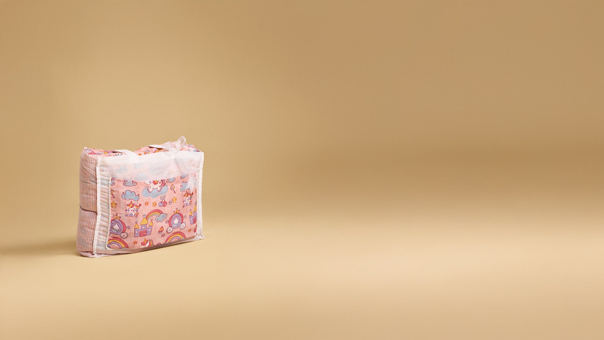 This reversible children's quilt showcases playful multicolour unicorns, castles, rainbows, and stars on a peach base. The reverse side features striped print. Hand quilted with natural cotton filling, it comes with two matching pillowcases, packed neatly in a handcrafted bag for everyday use.