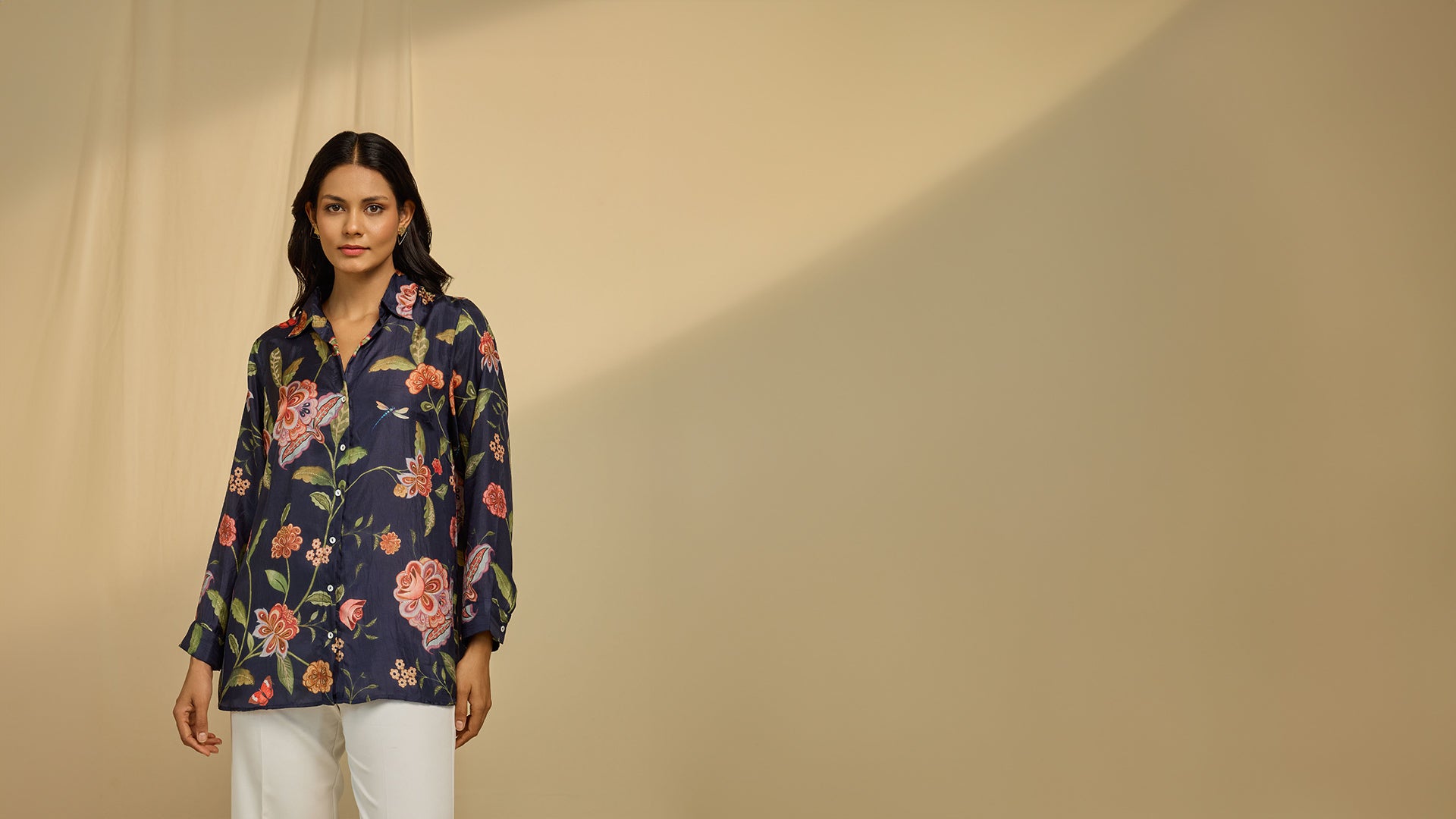 Crafted from luxurious silk, the Vogue Silk Shirt - Cocktail features a vibrant digital print, perfect for a chic and elegant look. This full-sleeve shirt is adorned with delicate shell buttons that enhance its sophisticated design.