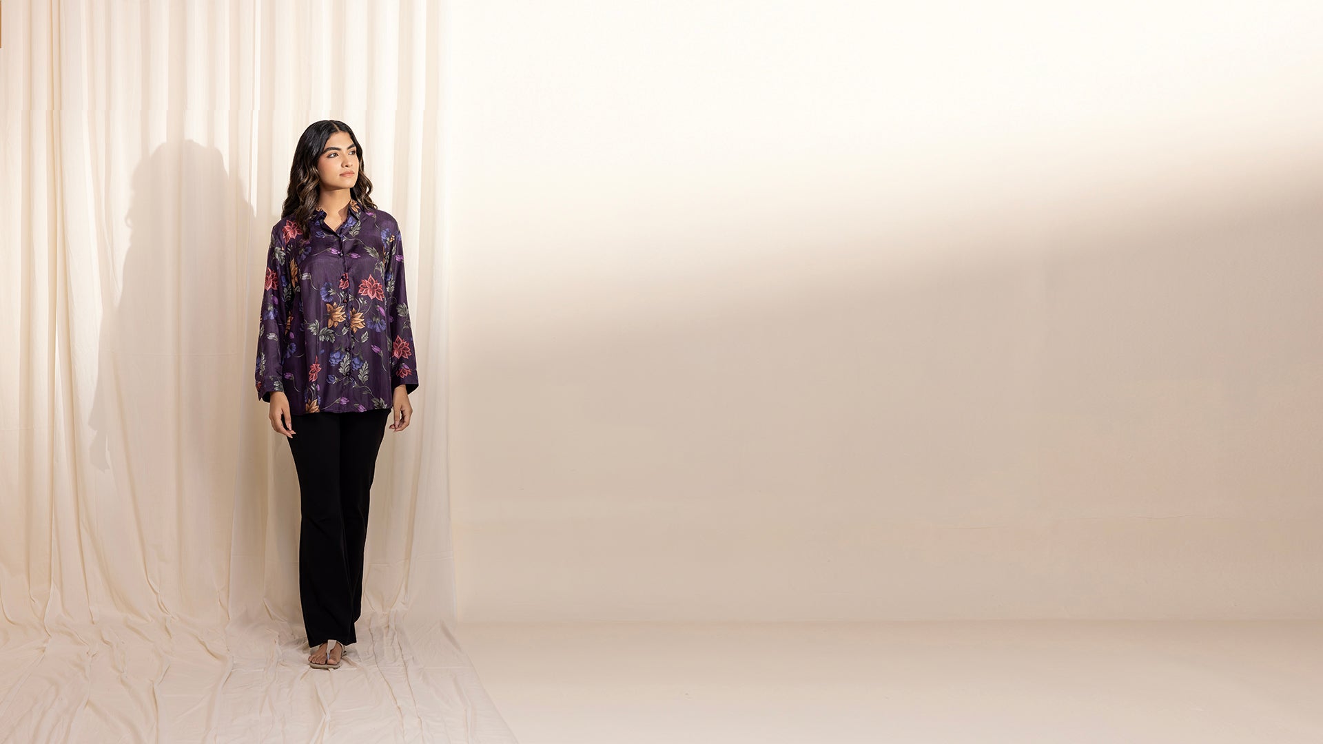 The Vogue Milan Silk Shirt features a purple base with bold printed florals in reds, browns, blues, and purple. This relaxed-fit silk shirt has a button down front opening with hand-made soft fabric buttons and slight gathers at the back for a graceful fall.