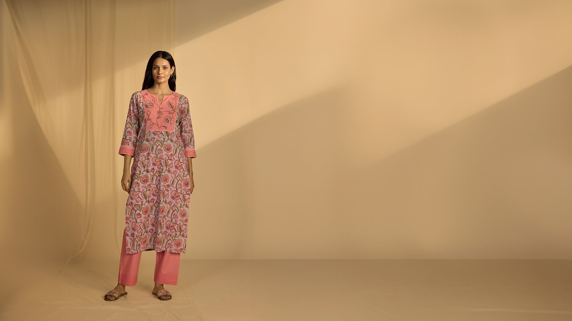 The Willow Cotton Kurta features a hand-block printed design with delicate floral motifs in shades of pink and green on a lavender base. It includes silver sequins and Silver Gota Lace details, pintucks on the yoke, and embroidered flowers on the sleeve cuffs.