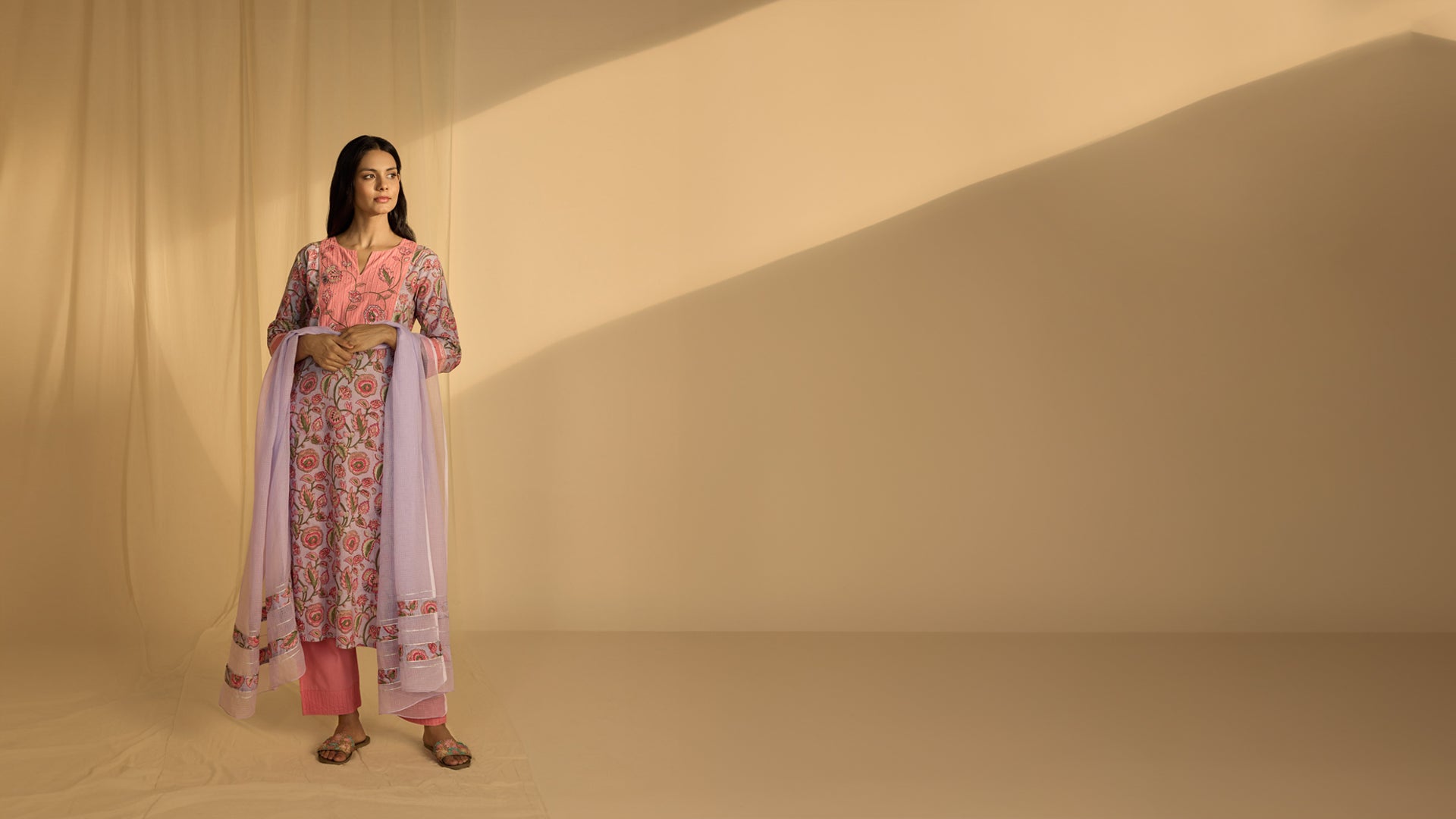 The Willow Kota Dupatta features a soft lavender hue with a unique floral border, adding a touch of delicate elegance. The dupatta is adorned with intricate floral prints and shimmering silver gota stripes that enhance its allure. Its light and airy texture make it perfect for layering, providing a subtle yet refined accent to your ensemble.