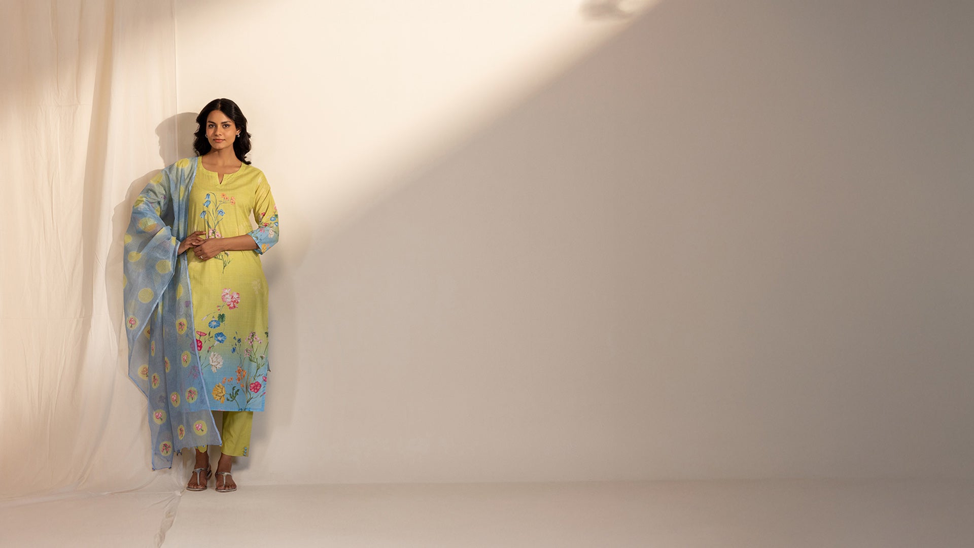 This bright and cheerful cotton kurta transitions from lime green to watery blue, creating a refreshing gradient. Adorned with a vibrant floral print, it features a straight cut and a round neckline, perfect for a summery look.