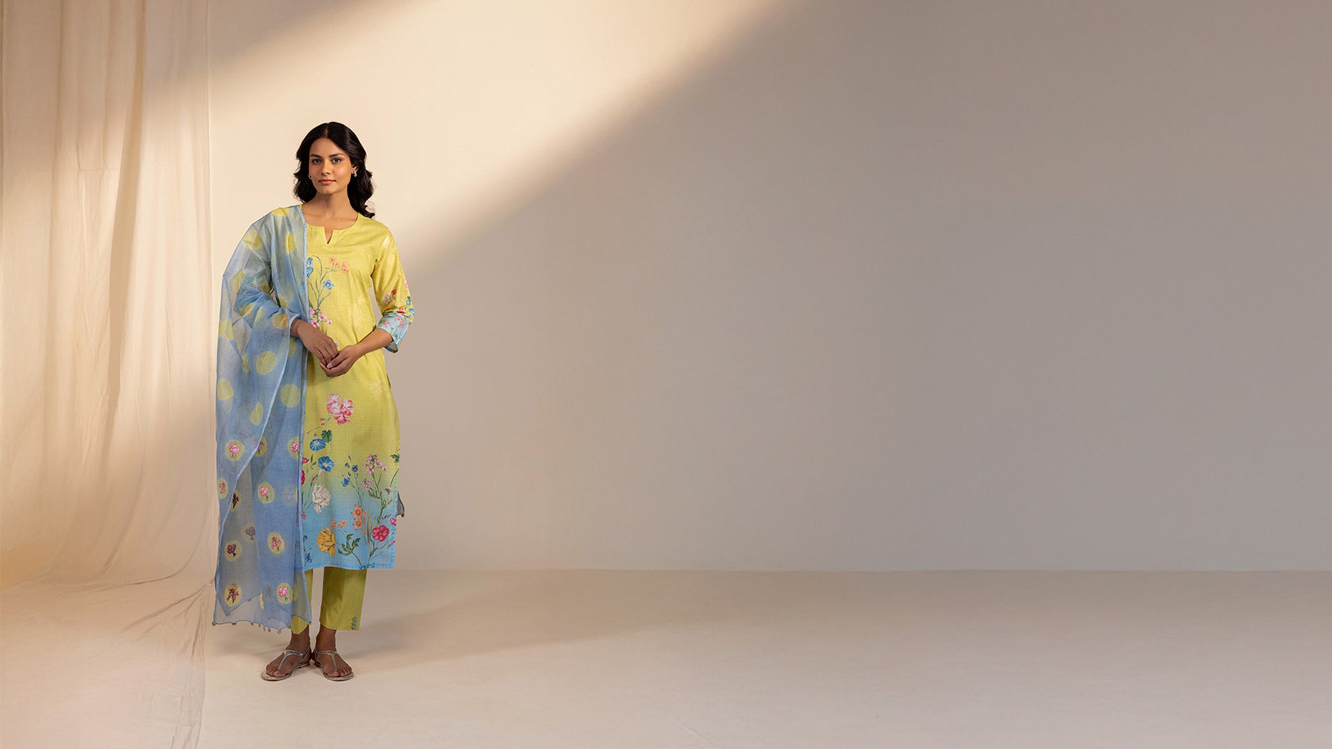 This dupatta is a true testament to craftsmanship, with intricate detailing and meticulous hand-dyeing in light blue and lime green to create polka pattern. Adorned with appliquéd flower buds at both ends, it features unique edging that varies along the length and width, adding to its distinct charm.