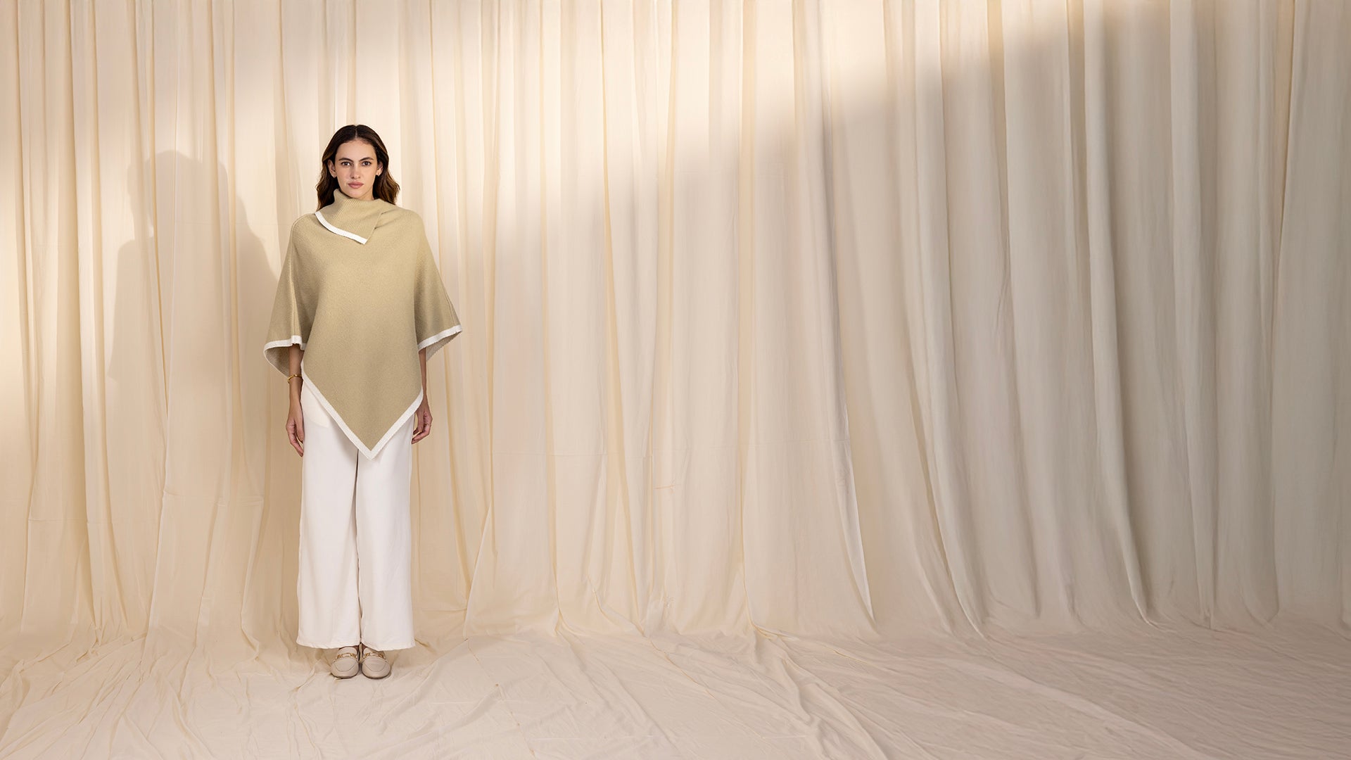 This woollen poncho in a pastel kiwi colour, features an angular flap collar and white border. Perfect for the upcoming colder weather, it pairs beautifully as a layered winter look and is easy to slip on and off.