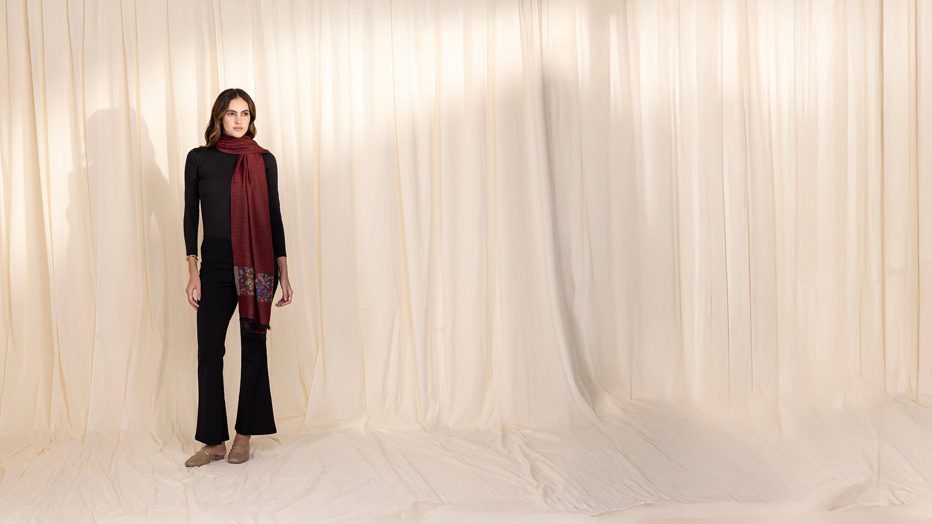 This elegant maroon woollen stole showcases fine woven stripes with a beautifully patterned panel of flowers and paisleys. The contrast of textures and motifs lends it a distinctive charm, making it a versatile piece that pairs gracefully with both Indian and Western outfits.