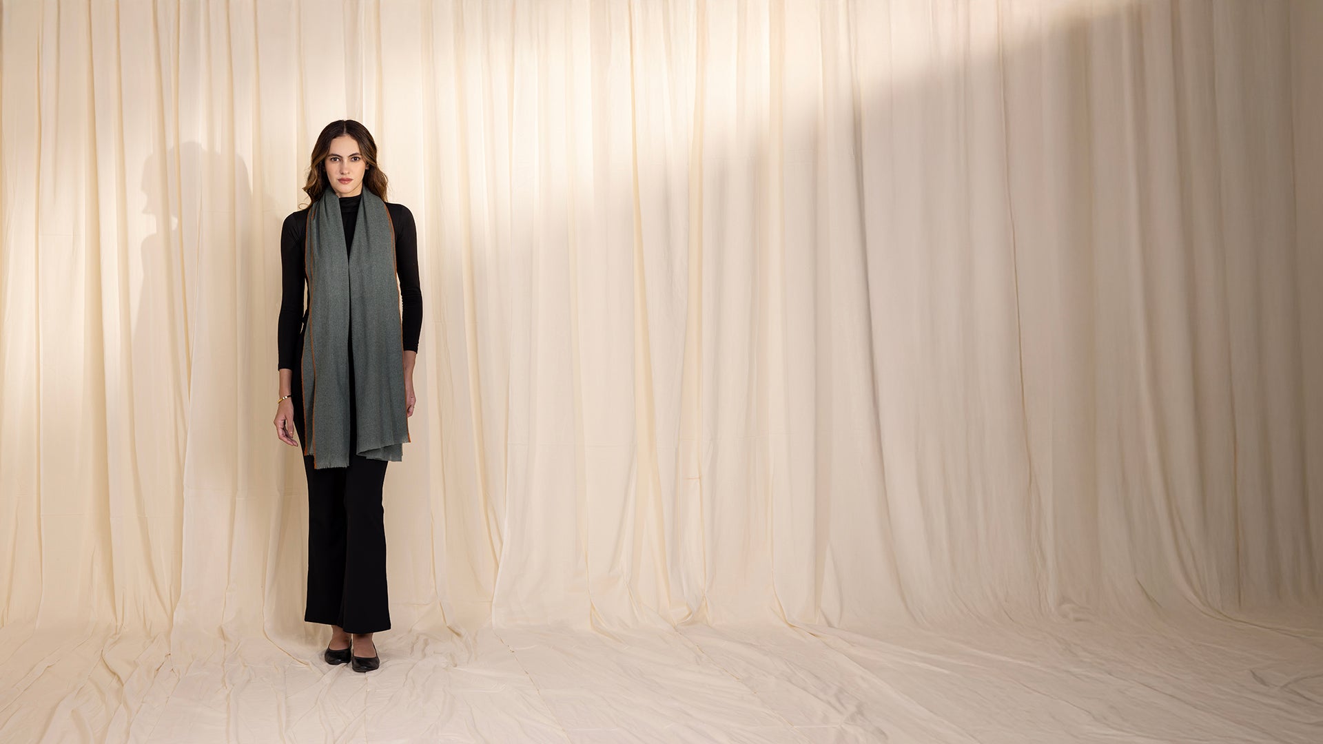 This soft grey woollen wrap is finished with a slim terracotta border. It’s ideal for layering over a sweater or styling as a scarf.