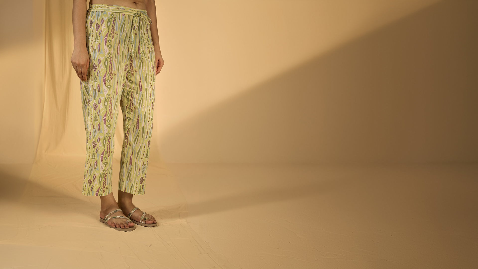 The Yellow Sketch Voile Seriously Short Pant features a playful Hand-Block Printed pattern in shades of yellow and light green, perfect for a breezy, casual look. Crafted from lightweight voile fabric, these pants have a straight fit, side pockets, and a semi-elasticised waistband, offering comfort and style for any relaxed occasion.